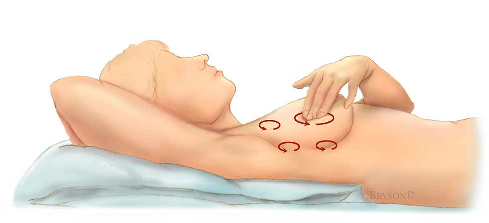 Cover the entire breast area from collarbone to below your breasts and up to the armpits. Slowly increase pressure from light to firm pressure to examine all depths of tissue